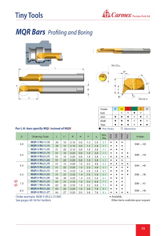 For L.H. bars specify MQL instead of MQR First choice Alternative